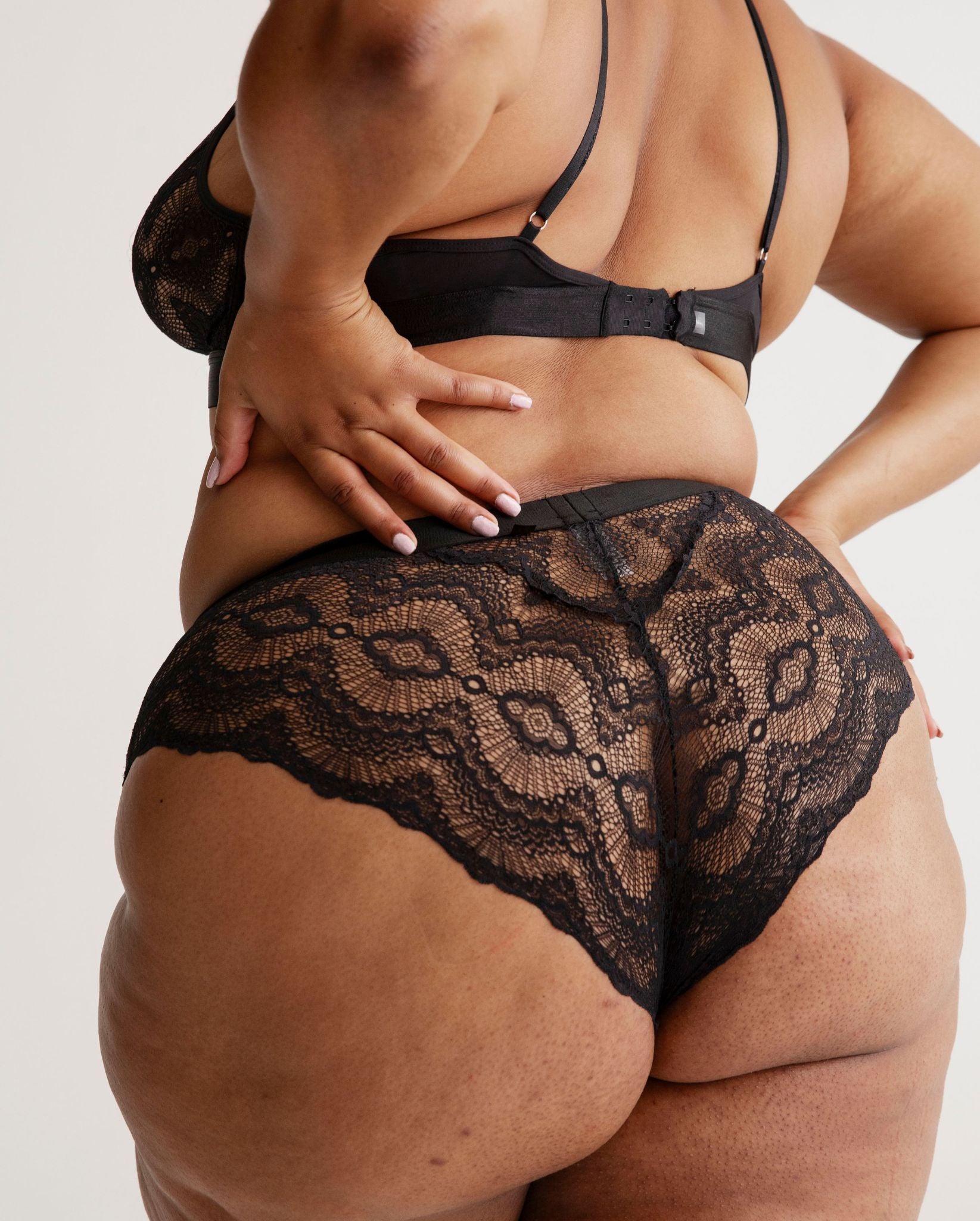 Lace panties with scalloped edges for a delicate finish. Breathable mesh panels at the sides keep things airy, while the mid-rise, ultra-cheeky cut flatters your bum with the cheekiest-of-them-all silhouette.