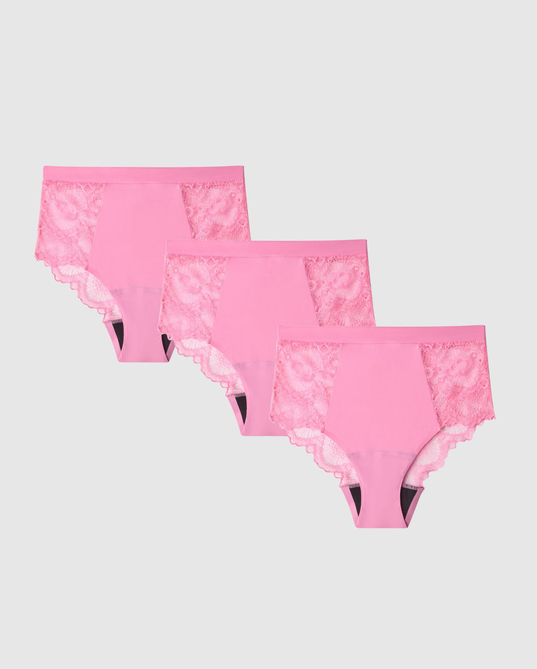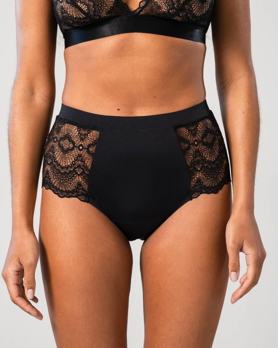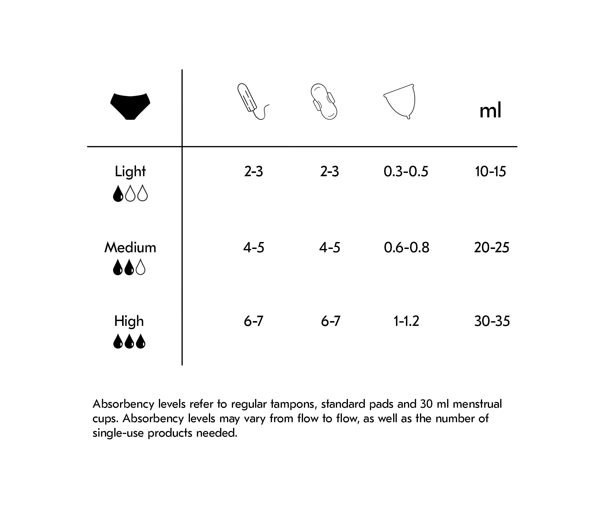 Unser Period-Proof Cheeky fasst bis zu 15ml (≈ 3 Tampons), der Lace Highwaist Brief fasst 25ml (≈ 5 Tampons) und der Micro Highwaist Briefs fasst 35ml Menstruationsflüssigkeit (≈7 Tampons).