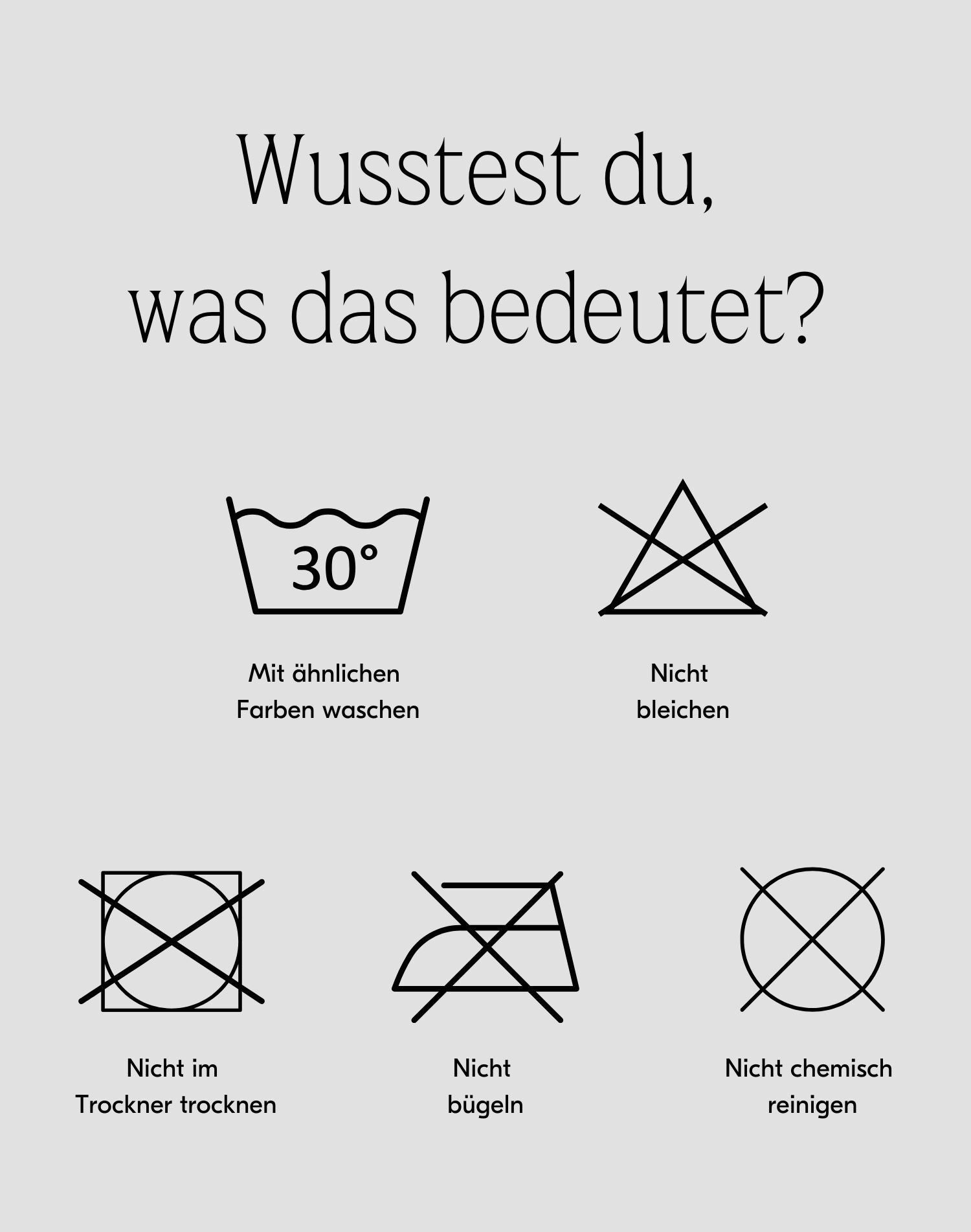 Wir empfehlen nicht, sie im Wäschetrockner zu trocknen oder zu bügeln, da die Hitze die Elastizität abbaut und deine Unterwäsche vorzeitig altern lässt.
