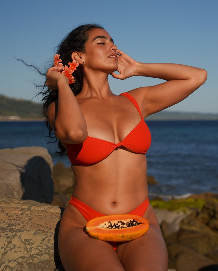 Meet our signature textured swimwear fabric with a terry finish, made using ECONYL®, a regenerated polyamide yarn made of discarded waste materials.