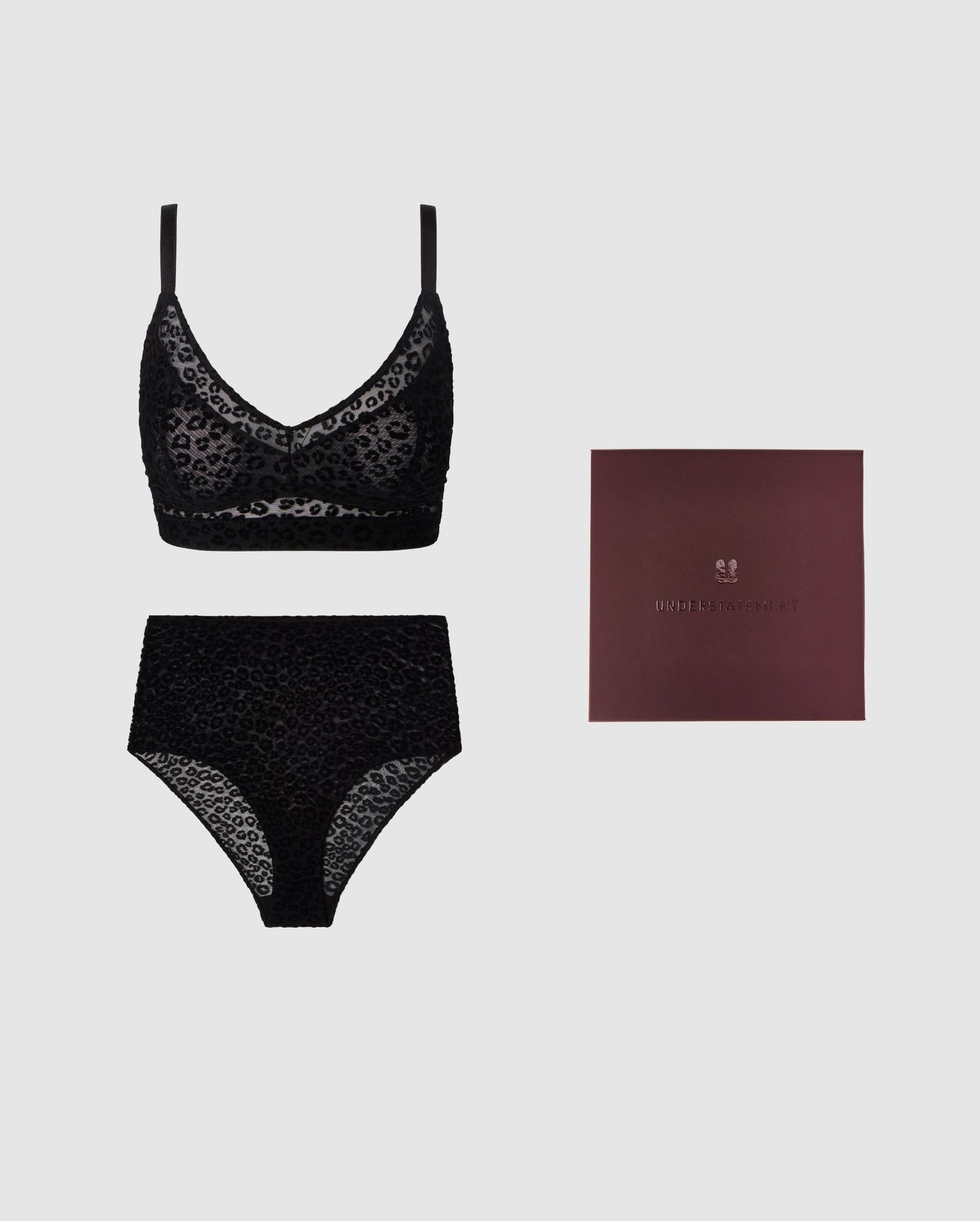 Unrestrictive support never looked this good. This set a match made in comfort heaven for the minimalist who loves a wild twist, including our bestselling Support Bra and our iconic Highwaist Briefs in a velvety printed mesh. Free gift box is included.