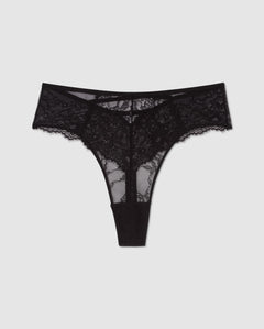 • Minimal bedeckender, hoch geschnittener Eyelash-Spitzen-String, kombiniert mit seitlichen Mesh-Einsätzen