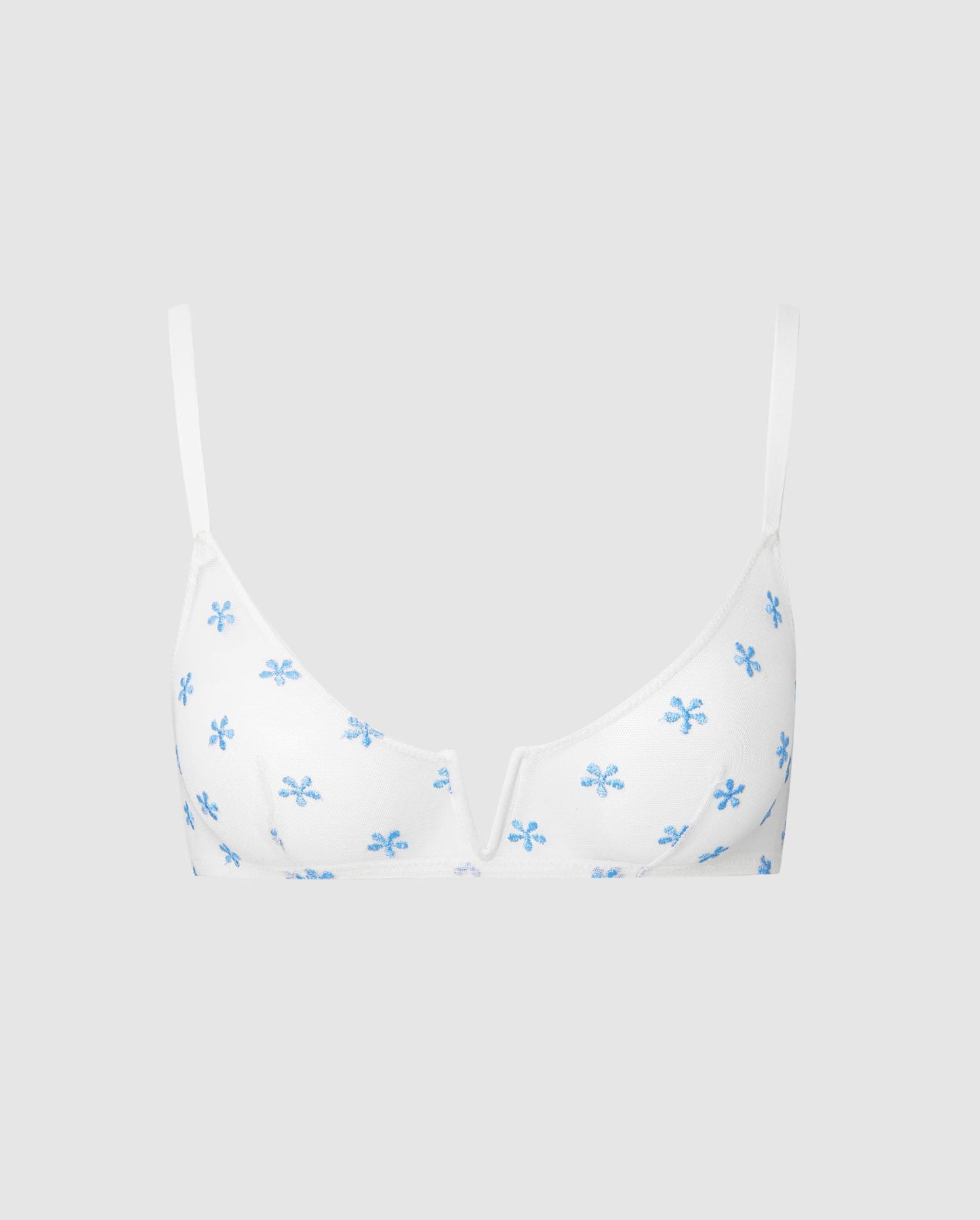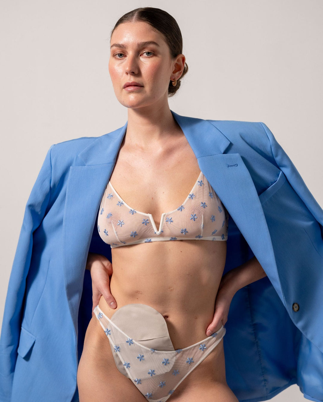 Aus feinem, transparentem Mesh mit babyblauen Blumenstickereien.