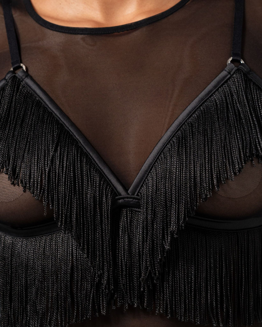 • Cupless design with fringe detailing along the cups and underband for a bold, playful look.