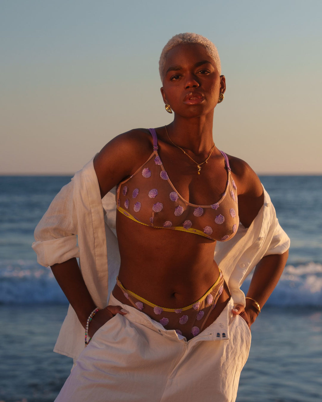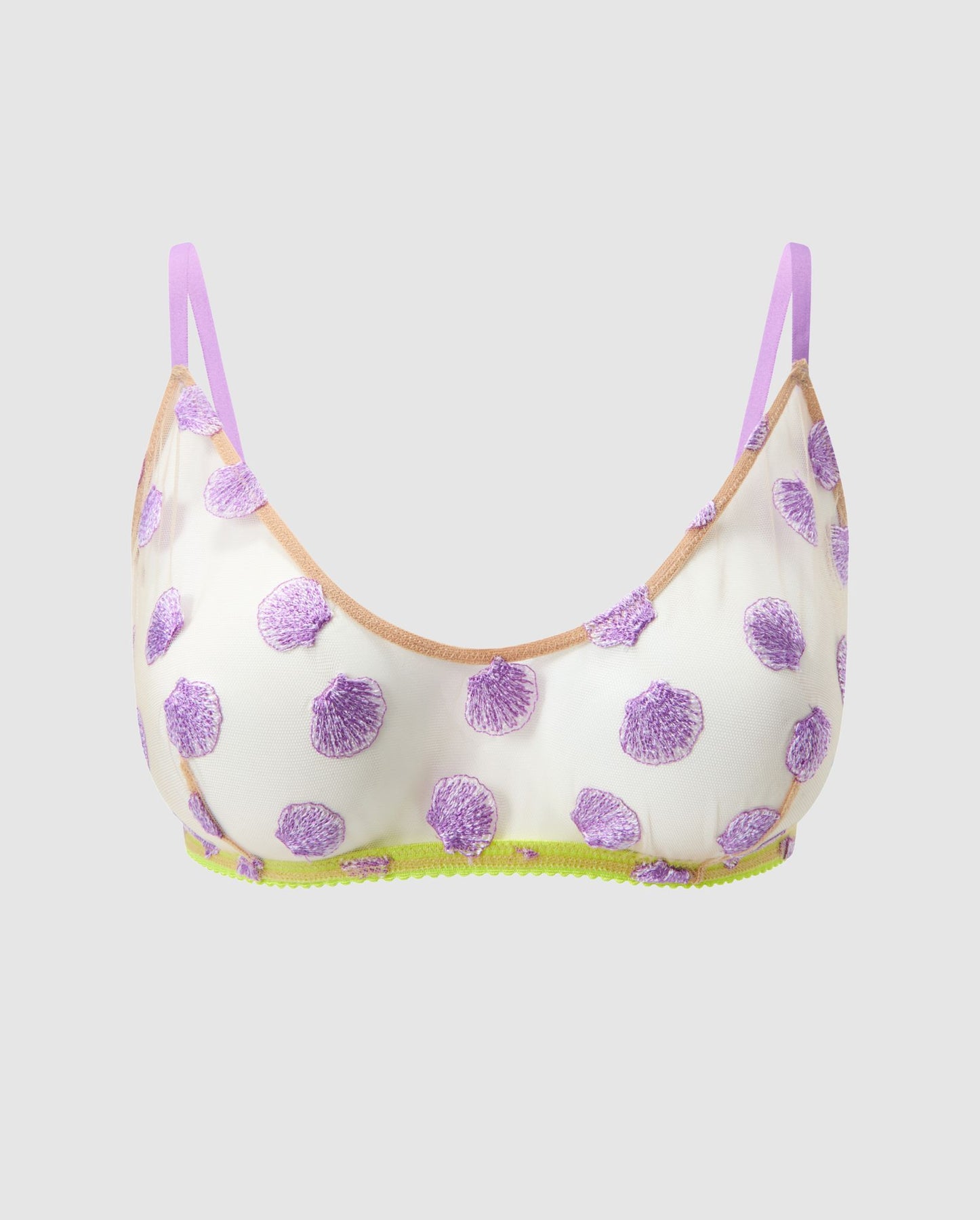 Crafted from a sheer mesh with all-over embroidered shells