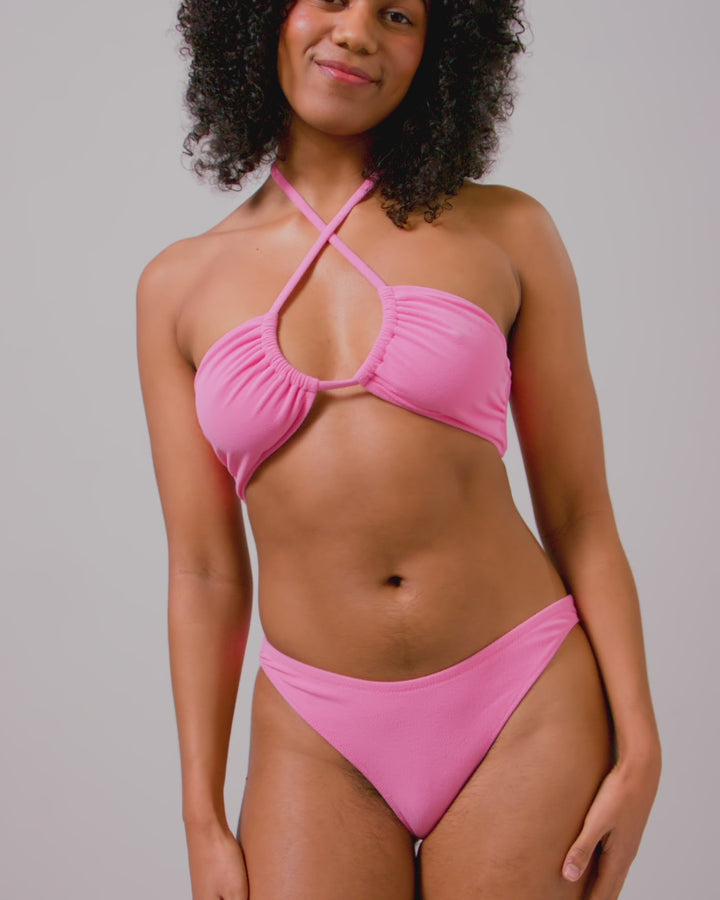 • Bandeau bikini top with straps that can be crossed and tied for different looks
