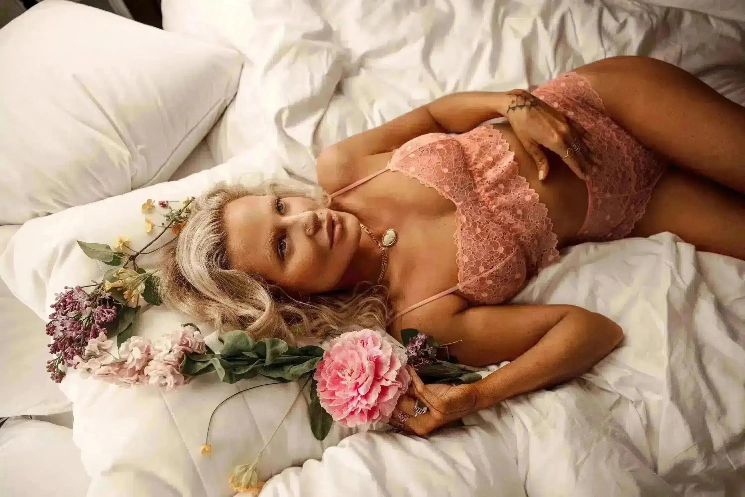 Frejais the goddess of love and fertility and she cares for mothers and children, the Freja styles are made of a classic floral lace in a fierce peach color.