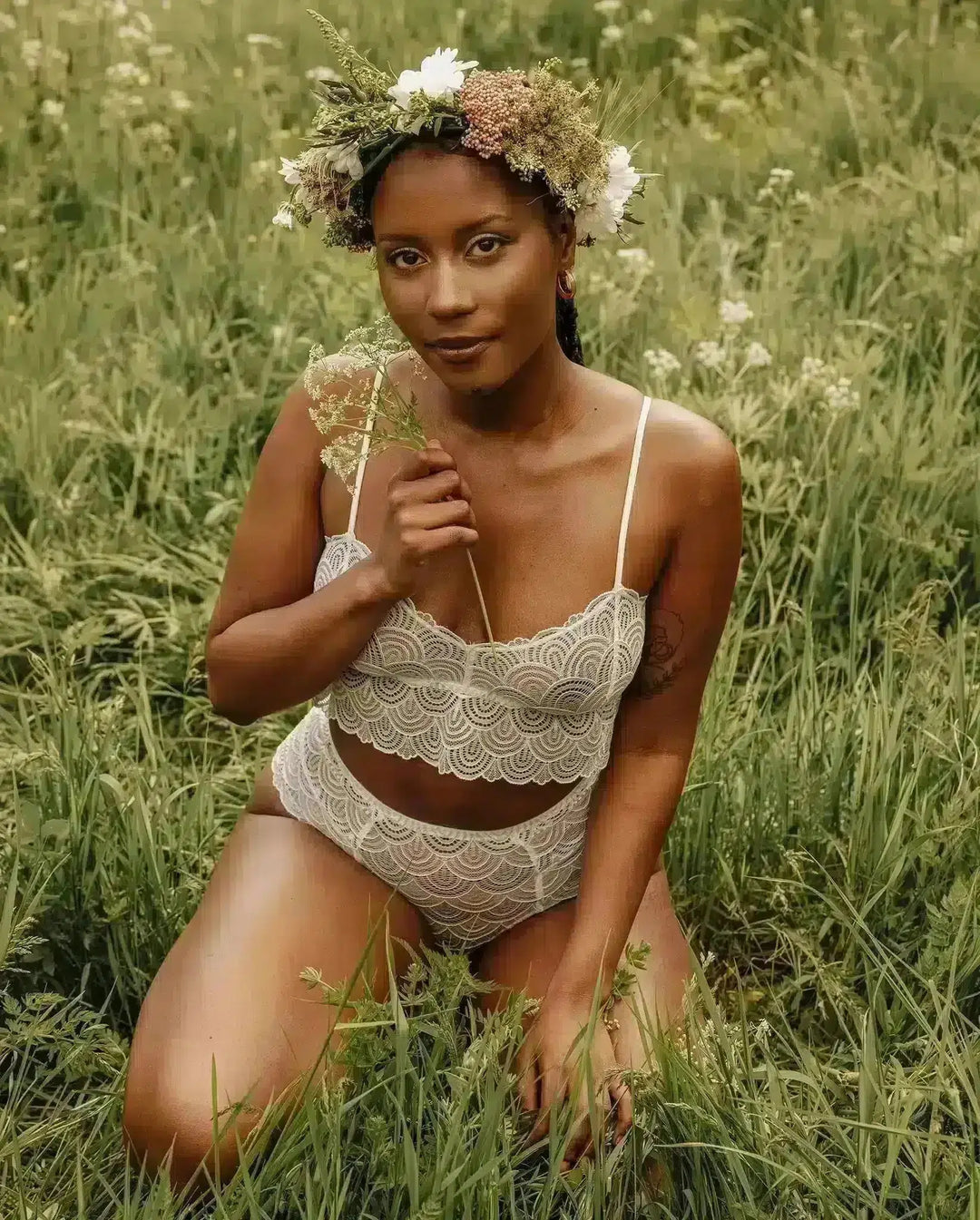 Idun is the Nordic goddess of eternal youth. She sings and dances in the fields, as everlasting as wildfire, celebrating good health and fortune. Free and ever-young, the Idun styles are made of a white and whimsical floral lace, a midsummer classic.